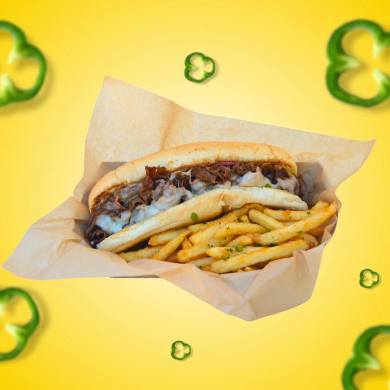 Baked hoagie roll, grilled shaved ribeye steak, grilled onions, peppers & mushrooms and topped with sliced provolone cheese, served with French Fries.