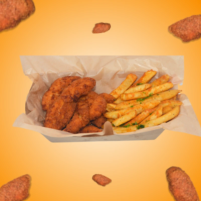 Hand breaded all white chicken meat, tossed in your choice of sauce, served with French fries.