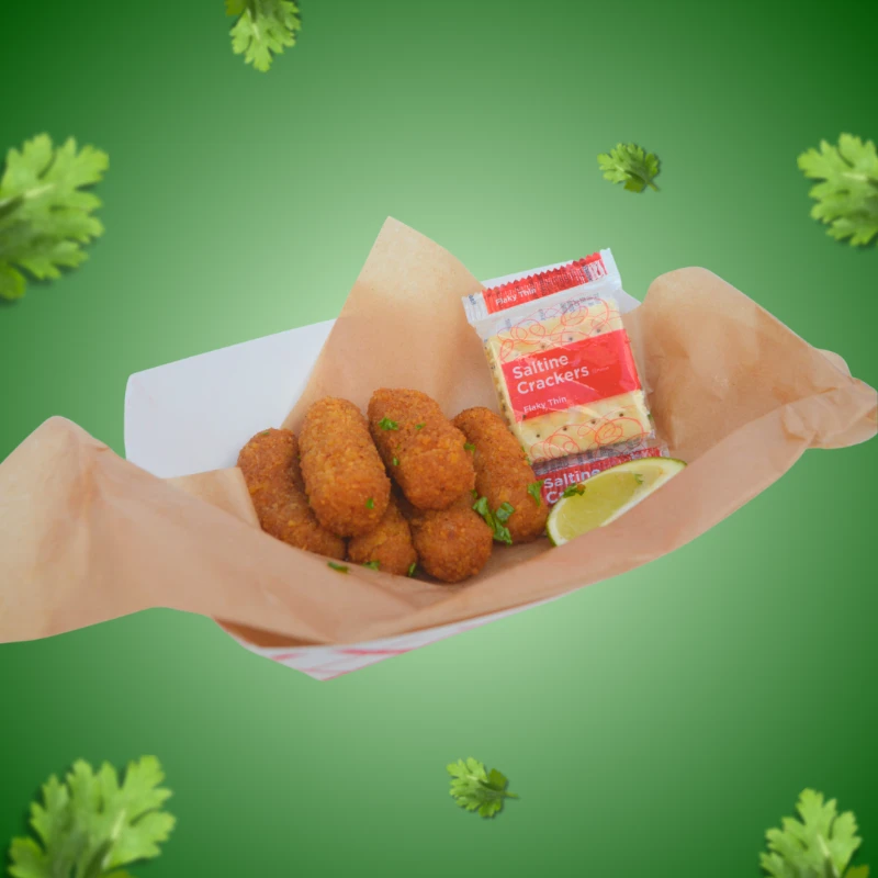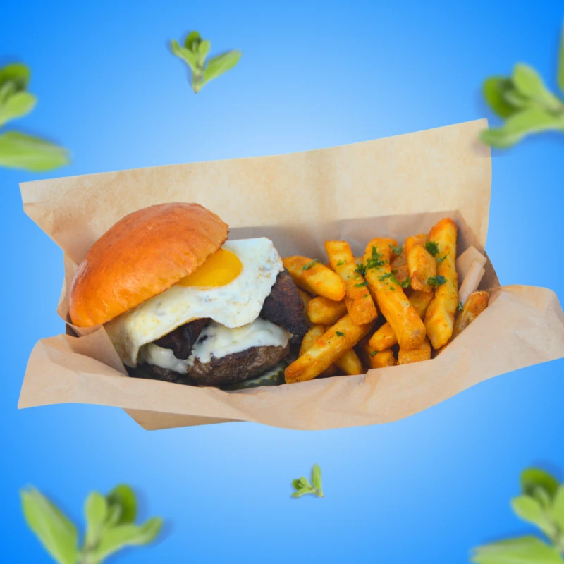 Brioche bun, garlic lime aioli with 6oz smash patties, Swiss cheese, sweet plantains and topped with a fried egg, served with French fries.
