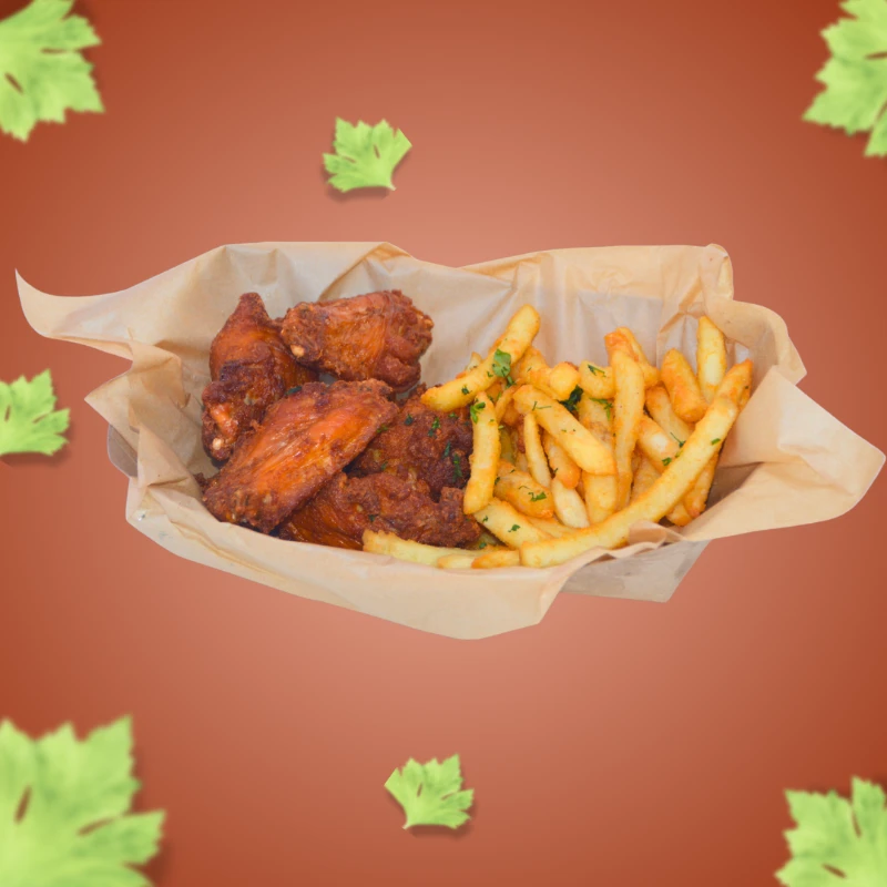 Jumbo wings, tossed in your choice of sauce, served with French fries.