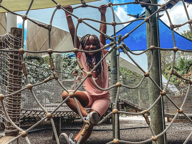 From a spiderweb climb, climbing ropes, a balance beam, slide to wooden bridges, the new playground made out of locust wood at Jungle Island provides hours of fun adventures for kiddos and parents.